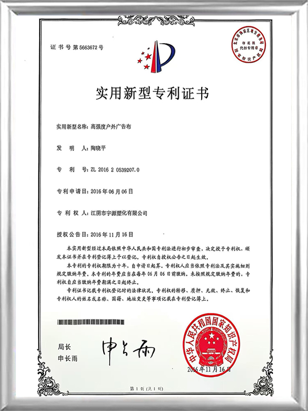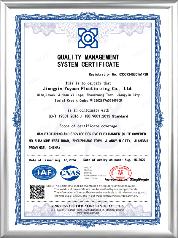 Компания YUYUAN имеет сертификат системы менеджмента качества ISO 9001, что подчеркивает нашу приверженность совершенству. Мы всегда поддерживаем превосходное качество нашей продукции—, гарантируя стабильное впитывание чернил, быстрое высыхание, отличную устойчивость к атмосферным воздействиям, надежную устойчивость к старению и так далее. Благодаря нашему исключительному качеству продукции, отмеченному многочисленными престижными наградами и высоко оцененному клиентами по всему миру, мы успешно расширили свое присутствие на мировых экспортных рынках. Теперь мы рады предложить наши профессиональные индивидуальные баннерные решения и надеемся на построение с вами надежного партнерства.